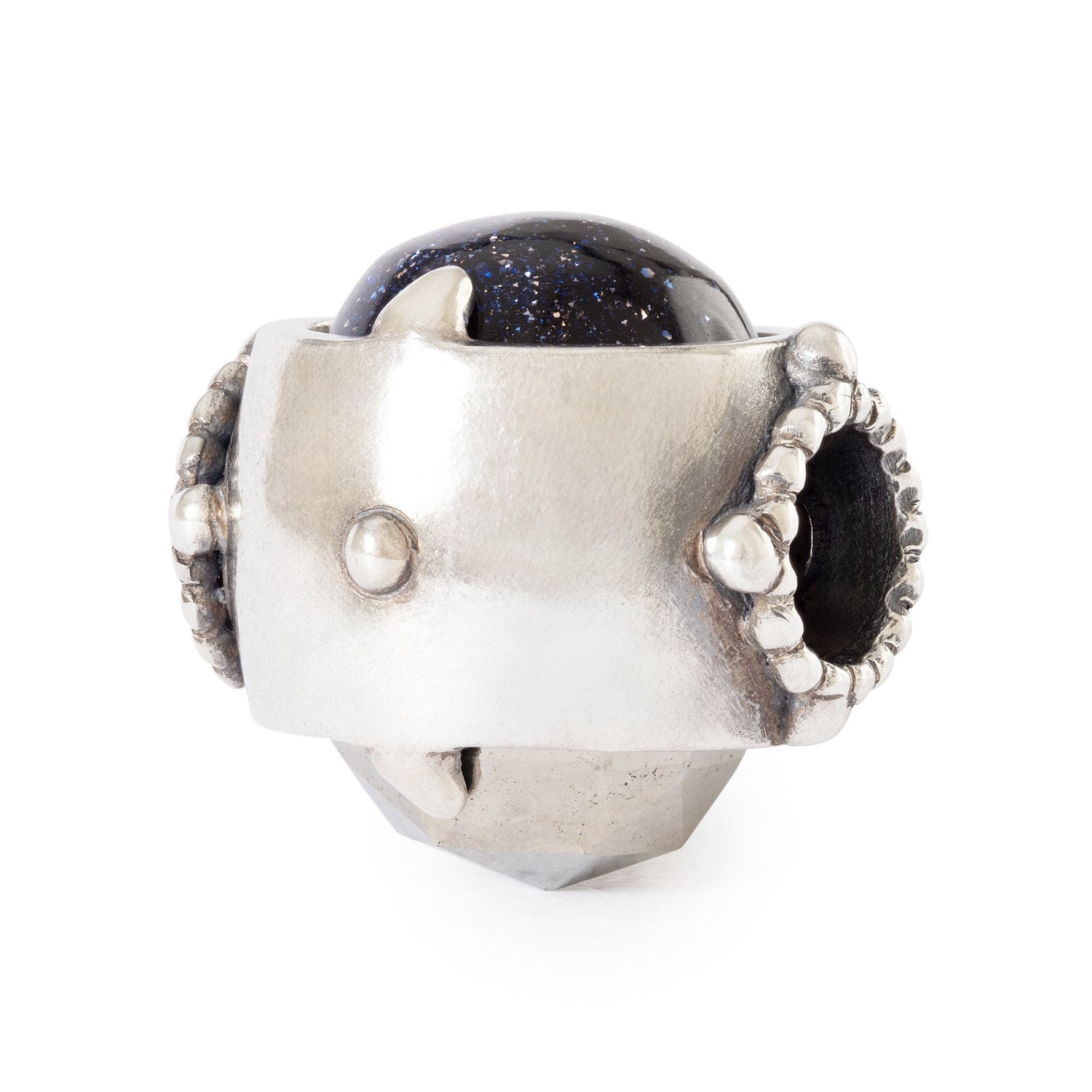 Tento sochařský korálek je vyroben ze stříbra a drží dva kameny v rovnováze. Pyrit nabízí sílu a